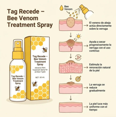 Tag Recede es un spray eliminador de verrugas que se aplica justo donde lo necesitas, sin dolor ni procedimientos invasivos. Su fórmula con veneno de abeja ayuda a debilitar progresivamente la verruga mientras favorece la renovación natural de la piel.